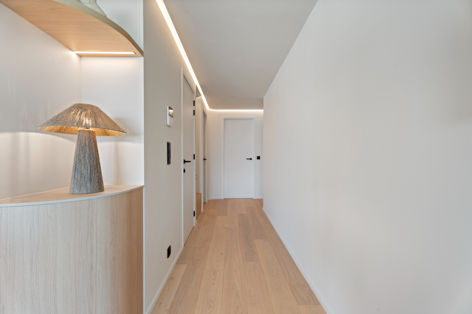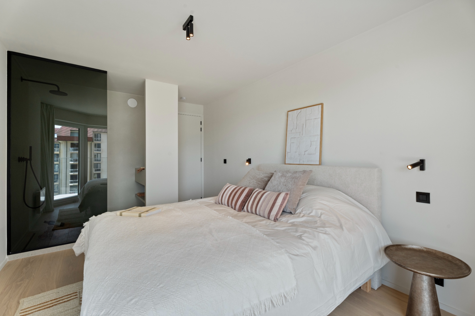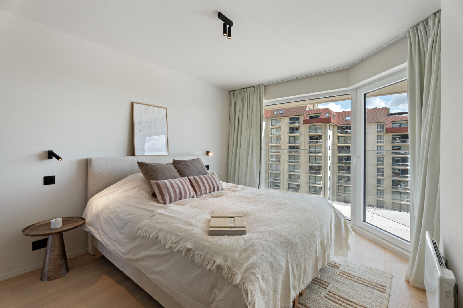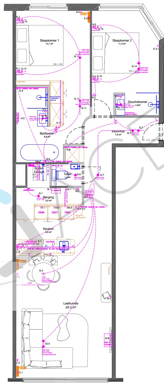 Indeling: inkomhal, aparte berging, apart toilet, lichtrijke woonkamer met terras en prachtig uitzicht op zee, open en volledig uitgeruste keuken, badkamer met alle comfort, twee slaapkamers waarvan één met eigen douchekamer. Beide slaapkamers geven uit op het tweede, zonnige en ruime terras aan de achterzijde van het gebouw.