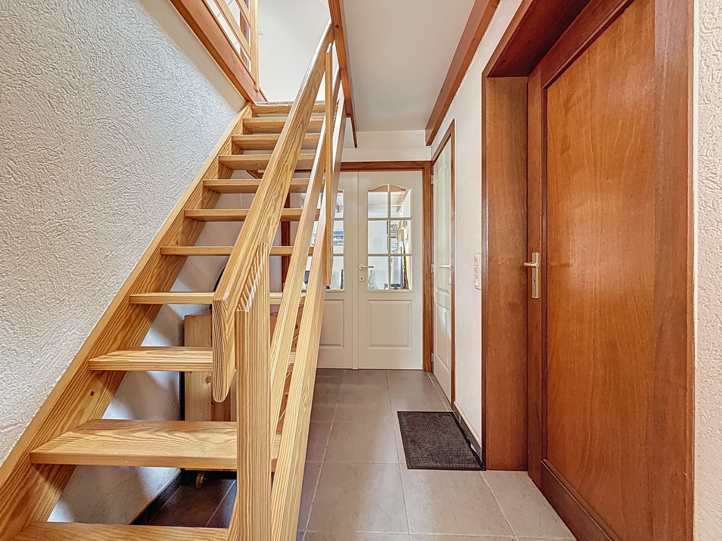 Indeling: inkom, gastentoilet, lichtrijke woonkamer met houthaard, eethoek open keuken met toegang tot de zuidgerichte tuin met aangelegd terras, garage met oprit. Op de verdieping zijn er 2 slaapkamers en een badkamer met inloopdouche, enkele lavabo en toilet en zolder.